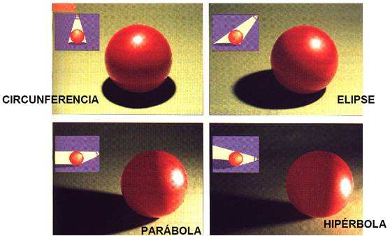 3) Iluminen una esfera con una linterna de modo que la sombra tenga forma de circunferencia, elipse, parábola e hipérbola, como se ve en estas imágenes extraídas de la presentación Rodeados por las cónicas.